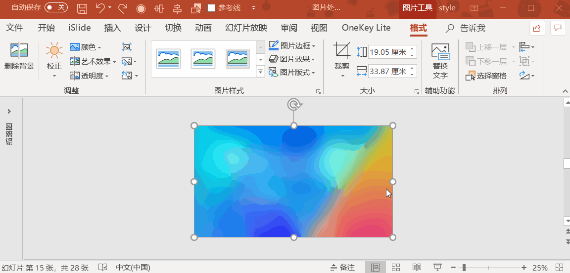 不对,可不是一张!再使用PPT自带的剪裁功能,缩小剪裁区域,随便移动一下又是一张全新的渐变背景,确认剪裁后直接拉伸放大就能使用。