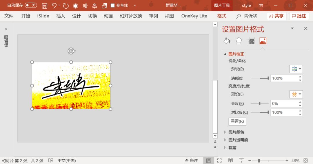 生成的图片是白底,和页面本身的背景色不同?没关系,再用一下PPT自带的“设置透明色”功能,一个扫描版的签名就大功告成啦!