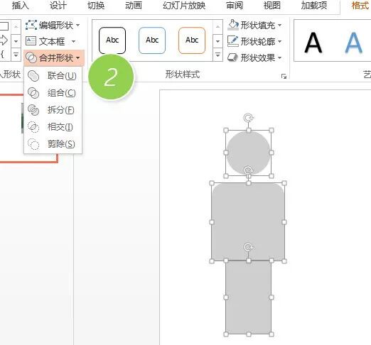 紧接着,全选三个图形,然后去除他们的轮廓线,把颜色改成灰色,然后利用图形“联合”功能(下图 2 处),将三个图形变成一个人形图形。