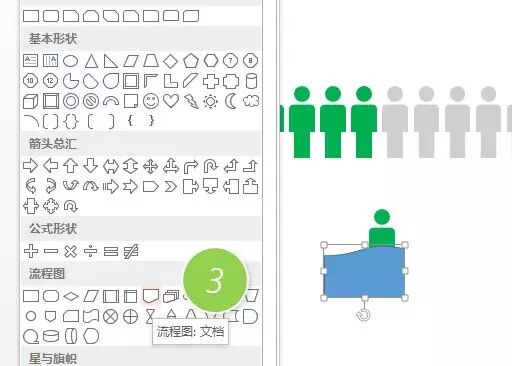 首先我们单独复制出来一个小人。然后插入一个“流程图:文档”图形(下图 3 处),然后让该图形与小人相交,相交的位置由大家自行决定,比如牛闪闪这个例子是在大约2/5人形处。