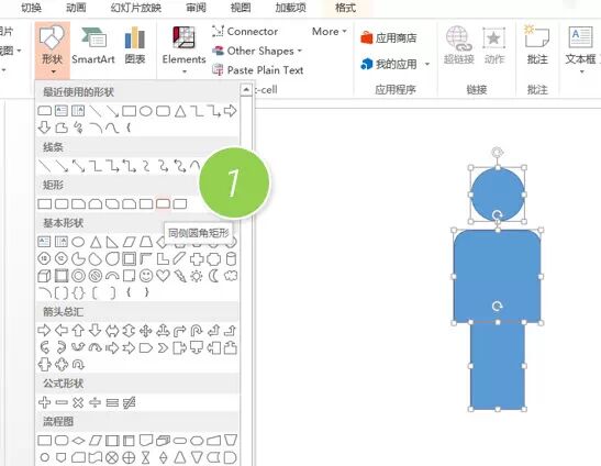 新建一个PPT页面,在图形中插入圆形、同侧圆角矩形(下图 1处)和长方形,然后组合出一个人形的图形效果。注意圆形(头)和长方形(腿)的宽度一样,同侧圆角矩形略宽。注意人形之间的比例。