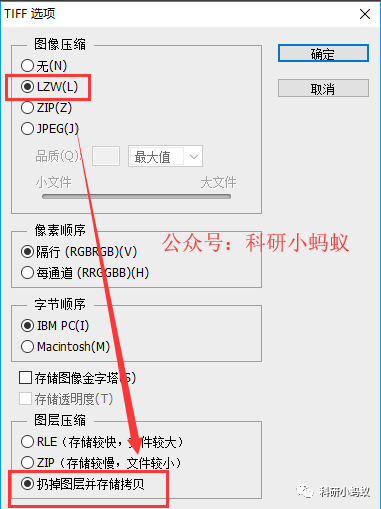 TIFF选项-图像压缩选择LZW(L)-图层压缩选择扔掉图层并存储拷贝。
