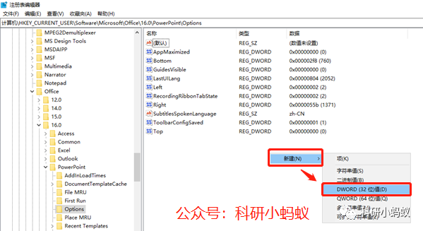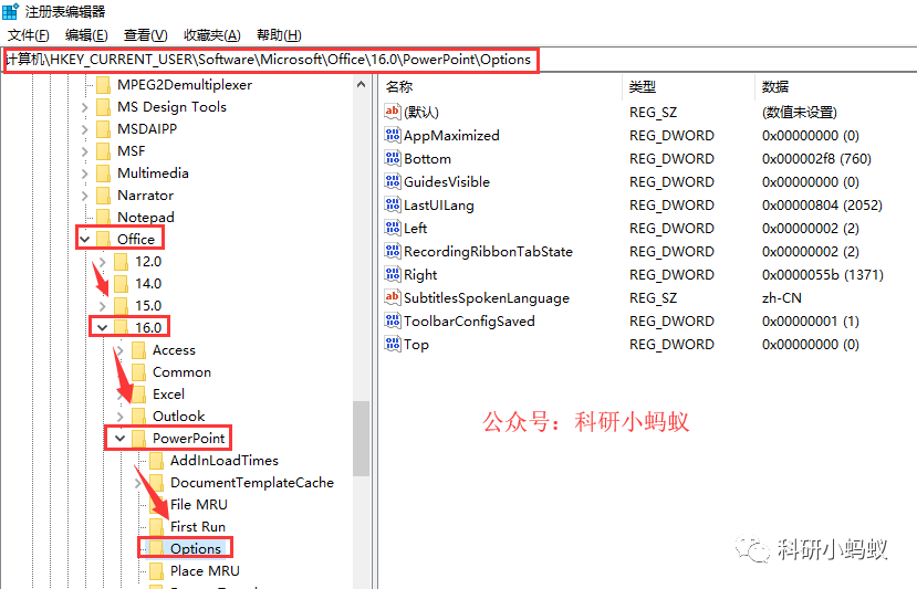 第三步:依次点击计算机-HKEY_CURRENT_USER-Software-Microsoft-Office-16.0-PowerPoint-Options。(2016和2019版本是16.0,2013版本是15.0,2010版本是14.0)