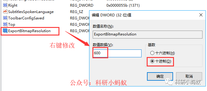 第四步:鼠标右键修改-数值数据600(需要多大分辨率就设置多少)-十进制。