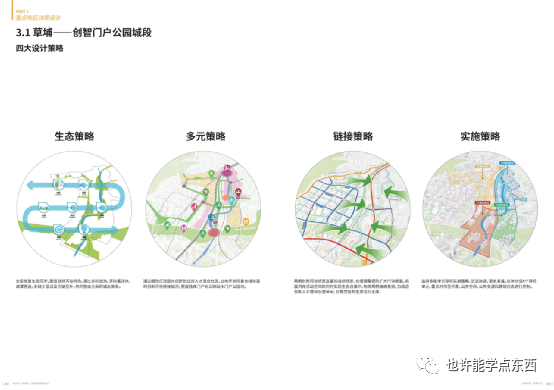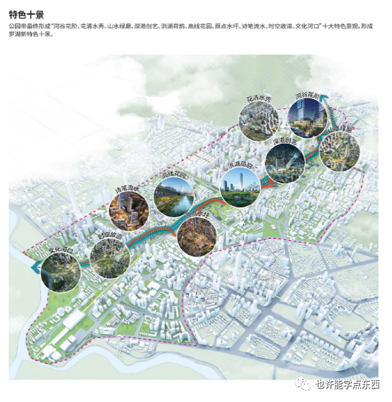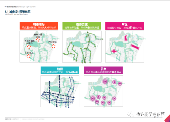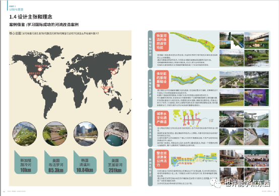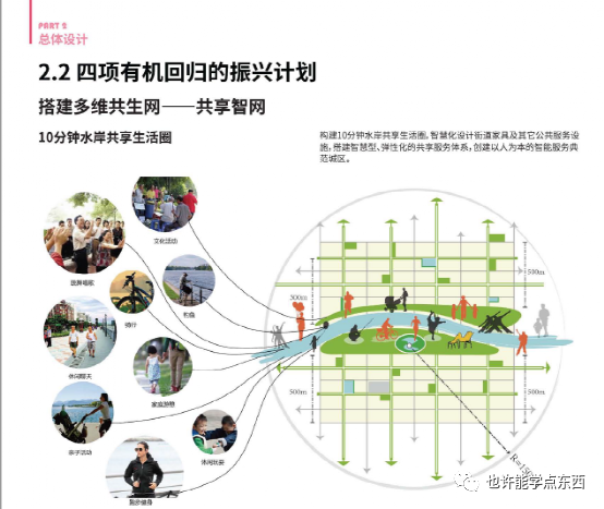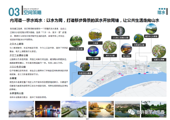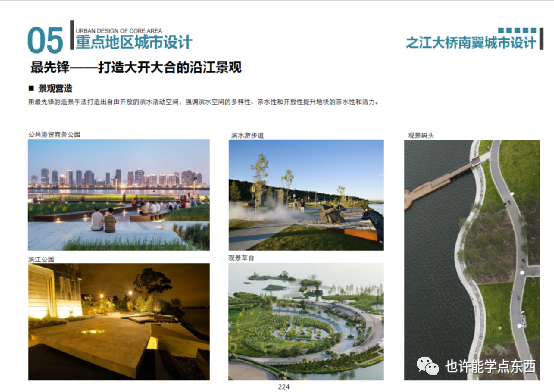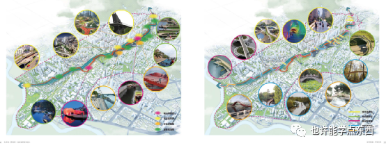 第五种:路径。常见于滨水河岸等线性场景中,沿着我们的研究路径,依次排列图片,这样图片带来的不止是视觉上的方向感,更有沿着路径一路地标场景的空间感,也能很好的表达滨水河岸一路的场景。