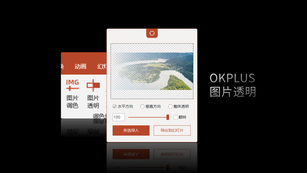 选择水平方向并设置数值后导出到幻灯片里,接着把半透明图片覆盖在色块上即可。