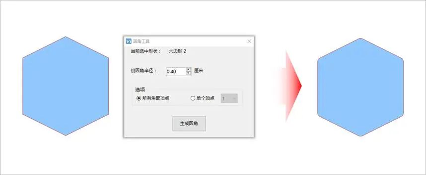 选中正六边形,点击【LvyhTools】-【编辑形状】-【圆角工具】,在弹出的【圆角工具】窗口中,将【倒圆角半径】设置为“0.4厘米”,点击【生成圆角】就可以得到一个圆角六边形。