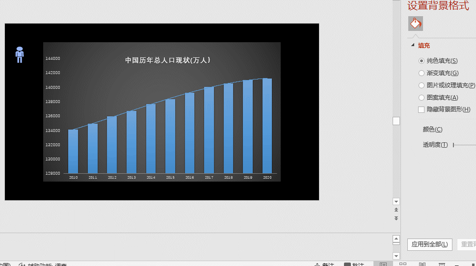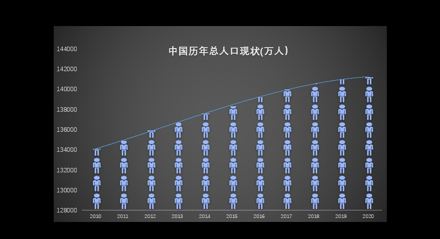 如下图所示,是中国人口趋势柱状图,如何进一步形象化呢?Step1:选中“小人”图标,Ctrl+C复制“小人”,点击下柱状,Ctrl+V粘贴到柱状里;发现小人变形了,需要调整;