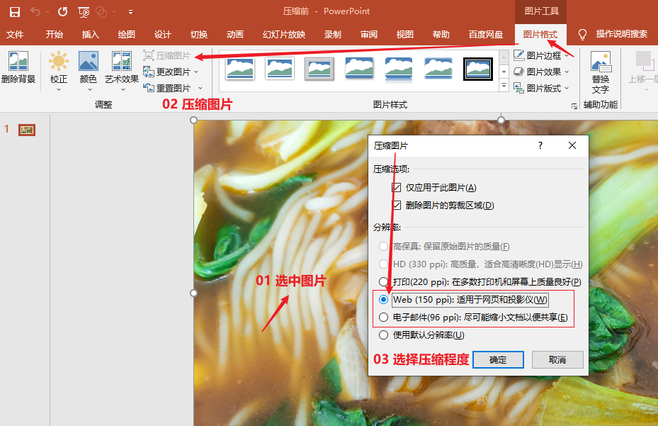 例如要发送一个比较大的PPT文档,但是苦于容量限制无法发送,这时候可以通过【压缩图片】功能,让PPT变小。比如,原来放了一张图片的PPT大小是1.69MB(1MB=1024KB),分别压缩成适合邮件共享、网页及投影的文件大小变成了154KB, 270KB, 也就是说可以压缩成原来的文件大小的1/11,1/6,是不是压缩效果非常明显?!! 一般情况下,清晰度Web(150ppi):适用于网页和投影仪的图片即可在电子设备上清晰展示,如果还需要进一步压缩,可以选择【电子邮件(96 ppi):尽可能缩小文档以便共享】。Step1:选中图片,点击菜单栏中的【格式】-【压缩图片】;Step2:选择所需的压缩程度,一般选择清晰度Web(150ppi):适用于网页和投影仪。法2:可以直接快捷键F12另存为,然后在保存边上有一个【工具】,下拉选择里面的【压缩图片】。点击压缩图片之后,会跳出一个与法1一样的窗口,选择Web(150ppi):适用于网页和投影仪。基本上就可以对整个PPT文件里的图片进行无损压缩。