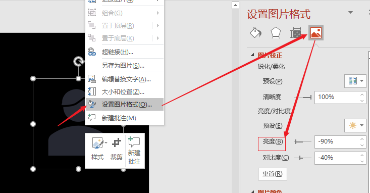 有时候有这样的苦恼:公司LOGO是深色的,PPT恰好也是深色背景时非常难以识别;或者logo各种颜色都有,放在同一个页面上非常难看,这个时候统一反白处理就非常简单、必要。如果LOGO等素材是一个矢量图形时,直接选中图片,右击鼠标,选择填充白色即可,非常简单;但如果素材是一个图片,这也非常多见,因为职场人多数是网上直接截图。这时候就需要图片校正了。Step1:选中图片,右击,选中【设置图片格式】;Step2:点击【图片图标】,调节【图片校正】中的【亮度】为100%即可。