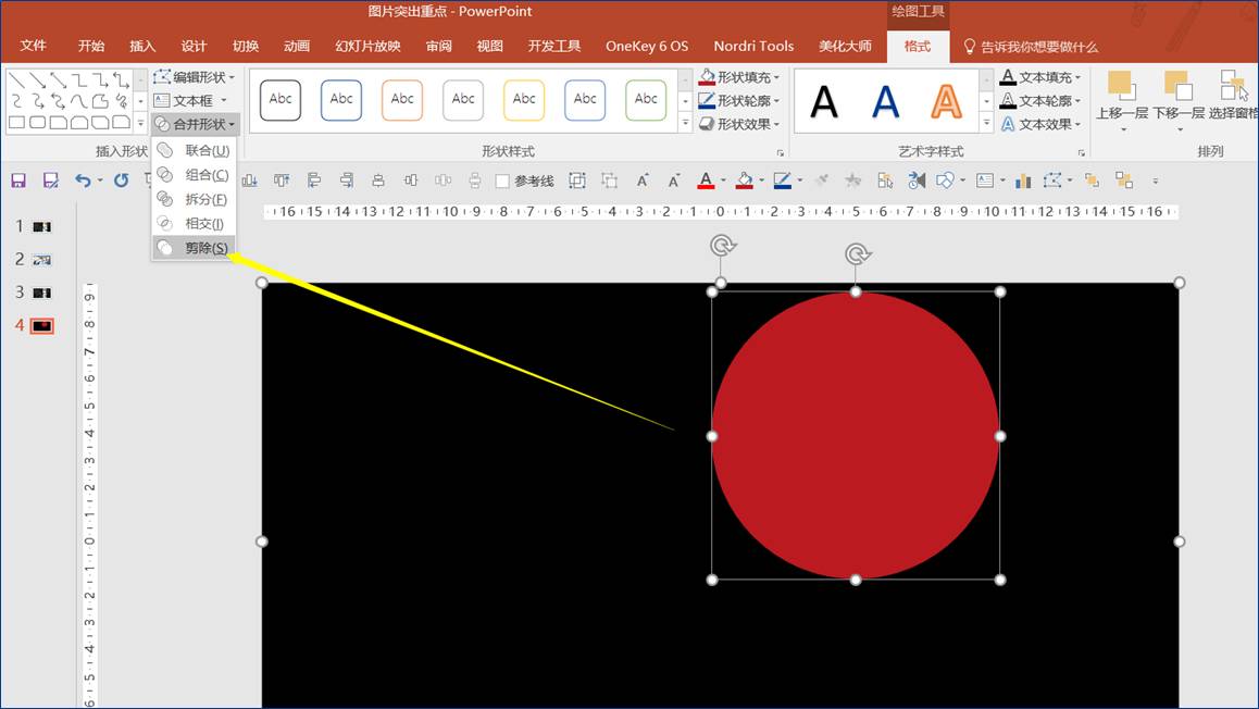 画一个充满全屏的矩形,然后另外画一个圆形(按住Shift画正圆),正好盖住女孩的脸。先选中矩形,按住Ctrl键,同时选中圆,单击"合并形状"中的"剪除"功能,在矩形上抠出一个圆。