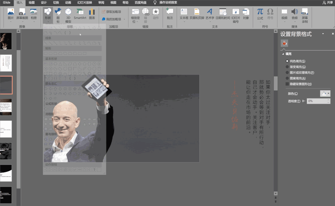 操作步骤:插入图片——插入色块——对色块进行渐变效果设置——将色块置于图片之上,具体操作如下: