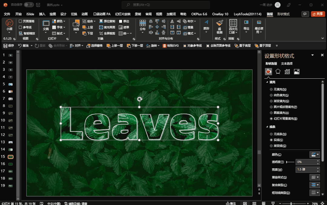所以需要先用小顽简报(可在文末查看安装包领取方式)的【矢量】功能将文字转化为形状,再去设置幻灯片背景填充方式。