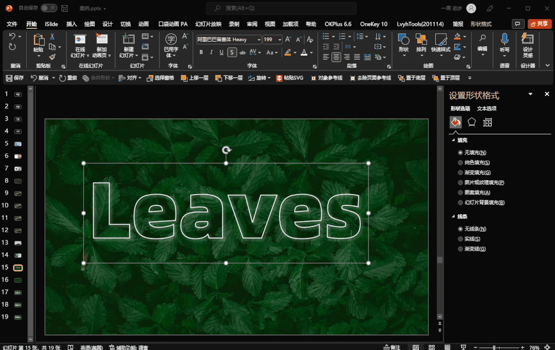 然后将文字放大,选中文本框,在【形状选项】中选择【幻灯片背景填充】就完成了。