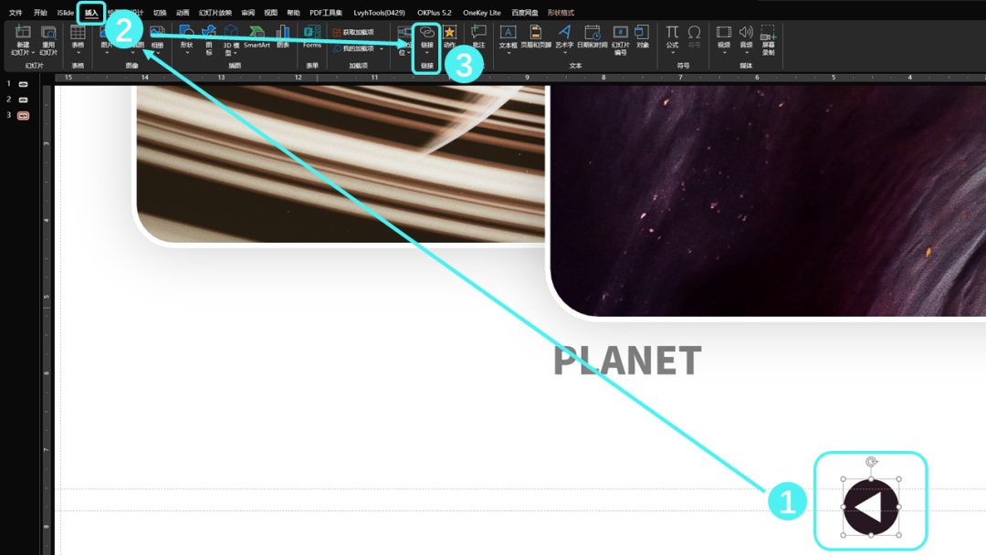 ——只有出现了“手”才更像是交互。那么这个超链接要怎么设置呢?点击左右图标,点击顶部的“插入”>链接