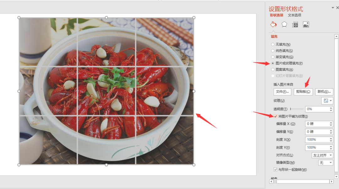 メ框选整个表格编辑区域——右键设置形状格式——填充——图片或纹理填充,勾选平铺,点击剪切板,将图片平铺到表格框里面。メ