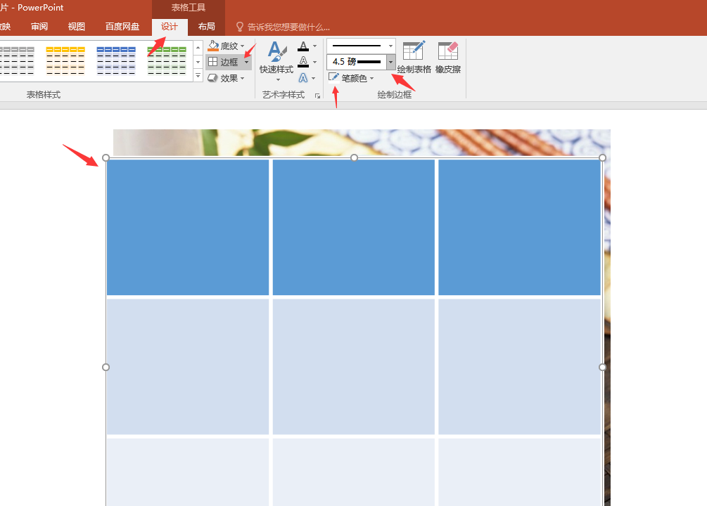 メ点击表格——布局,笔颜色改为白色,加粗4.5磅,添加表格边框线,这样好看一些。メ