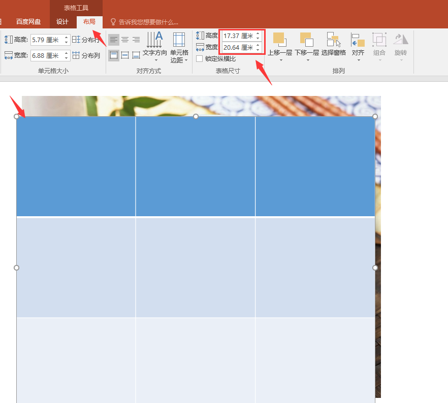 メ点击表格——布局——将表格的高度宽度,修改为跟刚才插图长宽一样的尺寸。メ