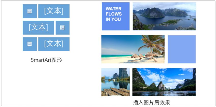 如果你不擅排版, 那就用SmartArt图形吧。SmartArt本身预置了各种形状、图片排版方式,只需要将形状全部或部分替换填充为图片,即可轻松将图片排出丰富多样的版式来,如图4-1 ~图4-3所示。