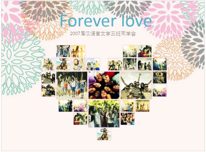 当一页幻灯片上图片非常多时,还可以参考照片墙的排版方式,将图片排出更多花样。如图2-8所示的心形排版,每幅图可等大,也可大小错落。能够表现亲密、温馨的感觉。