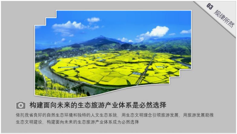 提到裁剪,很多人都知道这个功能,无非就是选择图片,然后单击【裁剪】按钮,即可一键式完成。但是,要想使图片发挥最大的用处,就需要根据图片的用途巧妙地裁剪图片,如图1-1所示为按照原图大小制作的幻灯片效果,而如图1-2所示为将图片裁剪放大并删除图片不需要的部分后制作的幻灯片效果,相对于裁剪前的效果,裁剪后的图片视觉效果更具冲击力。
