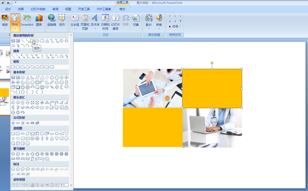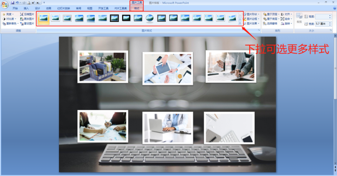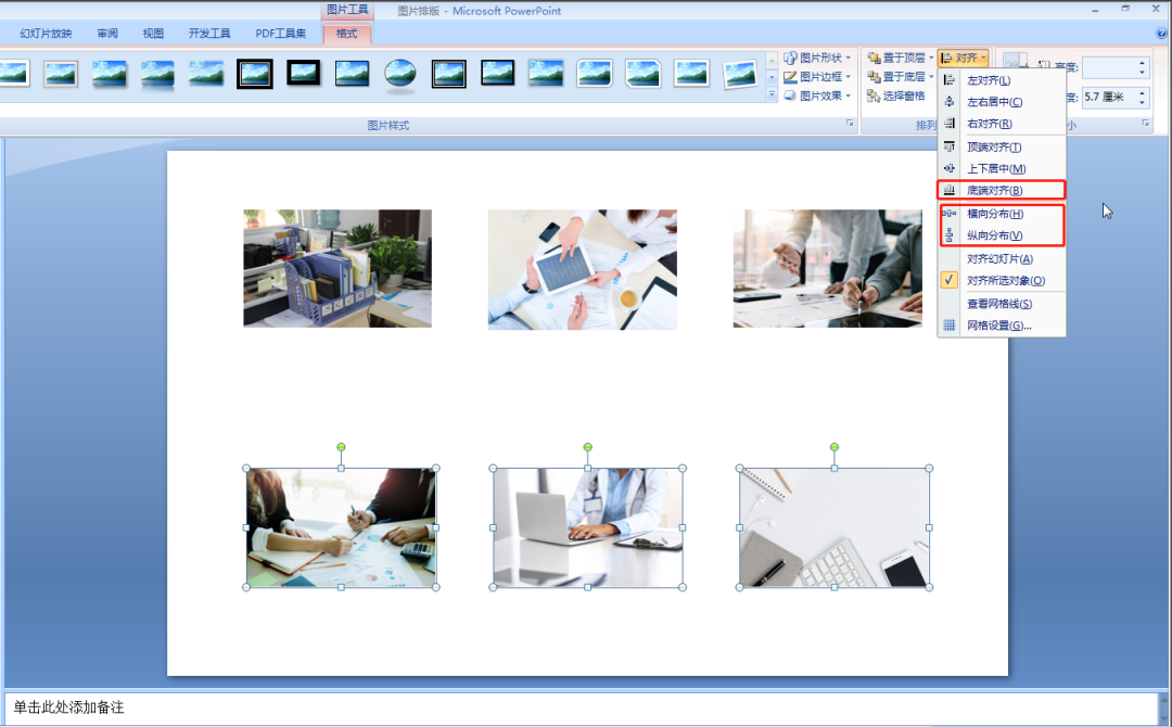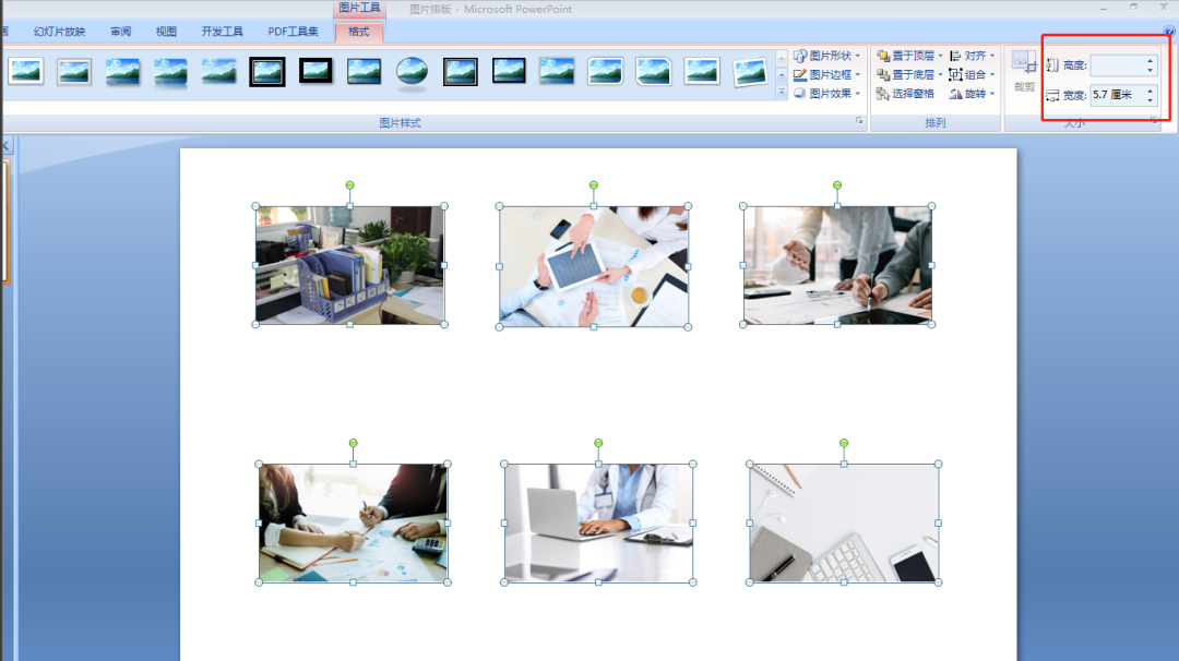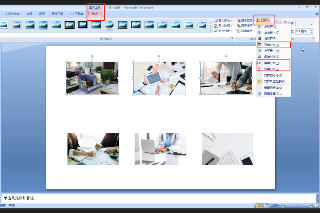 1、对齐排版 整齐的排版会给人一种很舒服的感觉。首先插入几张图片,按下Ctrl+A将图片全部选中,在【格式】中的【大小】统一设置图片的高度或宽度,将图片随意的分开,不让它们重叠在一起,如下图: 如下图,选中上排图片,点击【对齐】—【顶端对齐】,【横向对齐】、【纵向对齐】; 下排图片先点击【底端对齐】,同上。 2、色块辅助 要是图片很少,可以用色块辅助,让页面丰富饱满起来,这里就需要用到另一个形状的辅助,例子中用的是最常见到的矩形: 在【插入】中选择【矩形】,添加矩形到舞台上来; 调整矩形的颜色和大小,把它放到页面中缺少的部分补位即可。 3、边框辅助 在背景比较复杂,同时需要插入的图片也比较多的时候,加个边框之后排版上会好看一些。 选中所有图片,点击【格式】—【图片边框】,选择一个合适的样式,简单的调整下图片的位置和大小,让它们和背景更加融洽 4、形状排版(2010版本开始有这个功能) 如果觉得以上排版太单调,可以考虑用形状来排版图片,形状排版也不难做,用上PPT中的SmartArt图形即可:选中所有图片,点击上方菜单栏中的【格式】—【图片版式】中选择喜欢的图形,预览应用。 上面的小技巧你都学会了吗?虽然它们很简单,但是要把它们融会贯通还是需要勤加练习。有问题或者有想法的小伙伴欢迎在下方评论区留言,小编会在第一时间与大家交流!!!