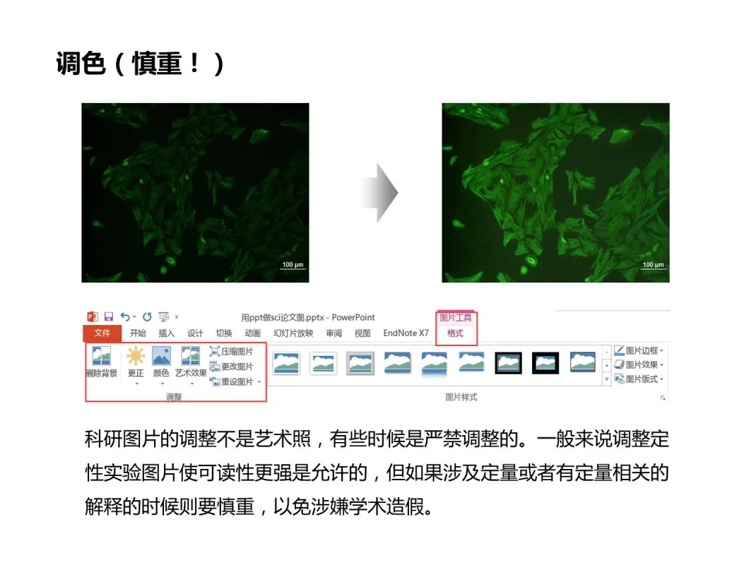 完成PPT导出图片分辨率设置之后,ppt就可以用来制作SCI论文图片了。科研图片往往从不同仪器获取,角度、大小、色彩等不一致,需要进行预处理。科研图片的预处理包括角度校准、剪裁、简单调色、调整大小等操作,这些操作都可以在ppt里面完成,而且处理完成之后可以马上用于排版、标注、组图,直到完成一幅标准科研结果图。下面以ppt2013为例,说明图片的预处理。ppt2010大同小异,ppt2007很多功能没有,ppt2003……算了,你别看了。