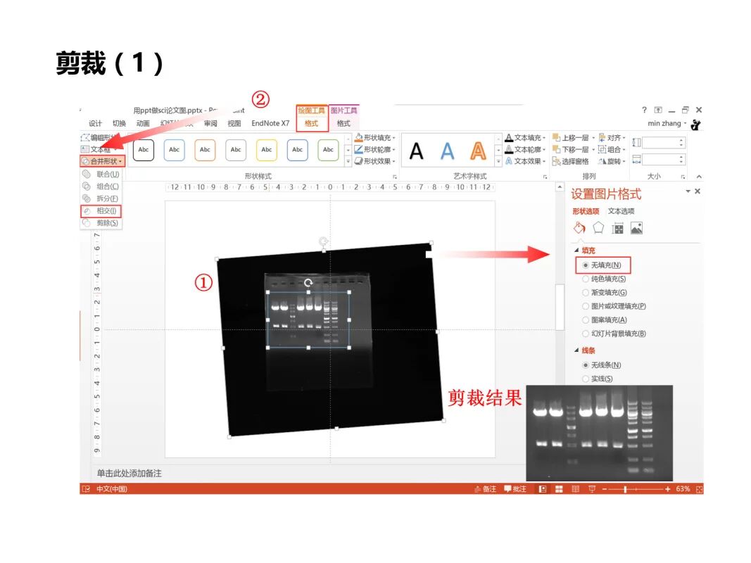 ②先选中电泳图,按住Ctrl键再选中插入的方框,这时菜单栏右上角出来绘图工具和图片工具,选中绘图工具,从左侧找到合并形状-相交,可以剪下上步矩形所选范围。