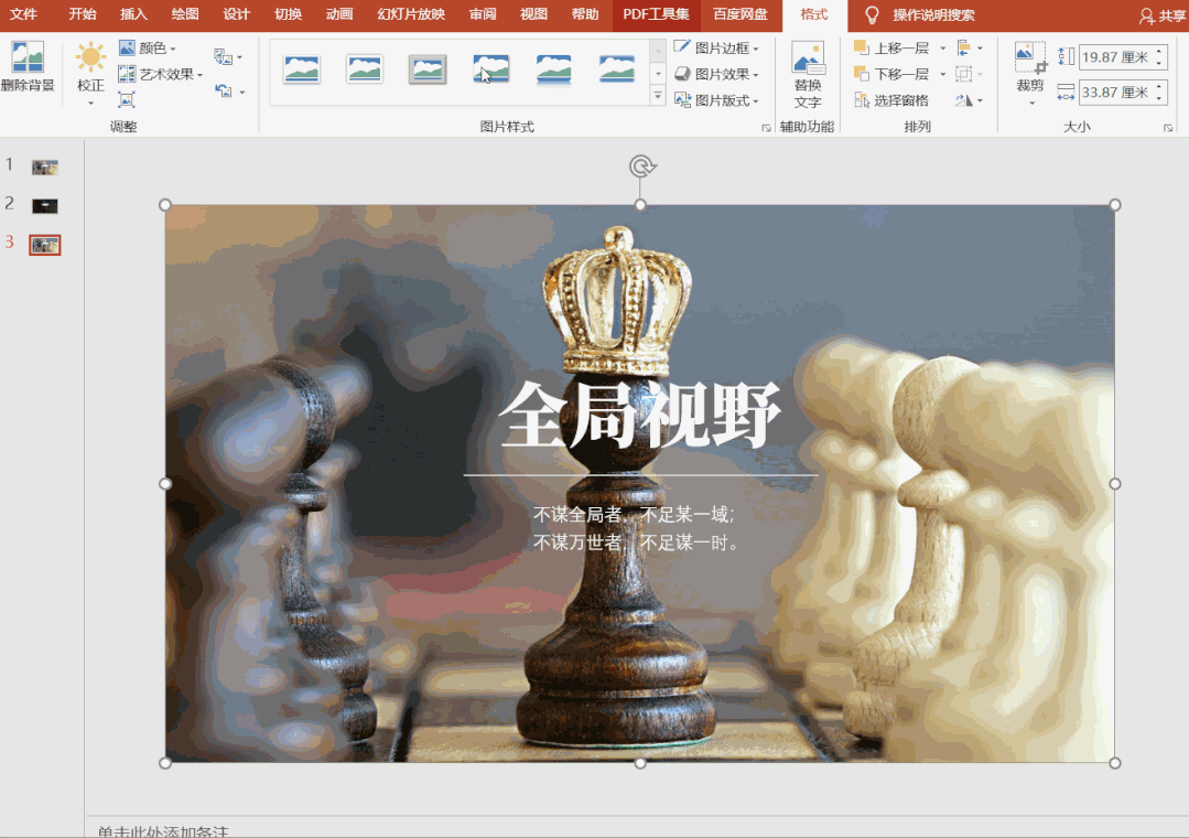 有时候我们在PPT中插入图片后发现,图片太亮了,或者图片色彩太丰富,干扰了文字,怎么办?