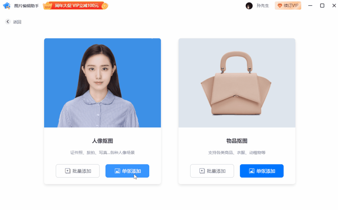 打开软件的「抠图换背景」功能,按图片分类上传到「人像抠图」或「物品抠图」中,上传后稍等几秒即可看到抠出的主体。