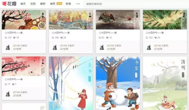 许多网站也采用了卡片式风格进行内容展示,比如Dribble、behance、花瓣网等↓
