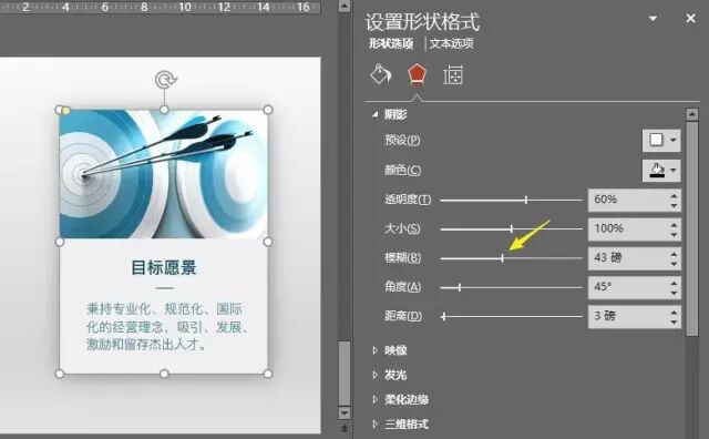卡片风格常常通过阴影来勾画轮廓。为卡片添加阴影时要调整阴影选项中的模糊度,使阴影呈现弥散外观,模拟卡片悬浮效果,形成层次感↓