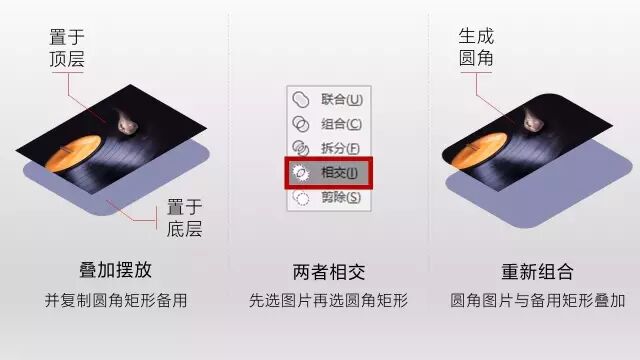 使用圆角后,为了看起来更真实,卡片上的图片或色块也要做圆角处理。这里要用到PPT的形状相交功能↓