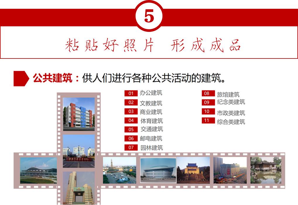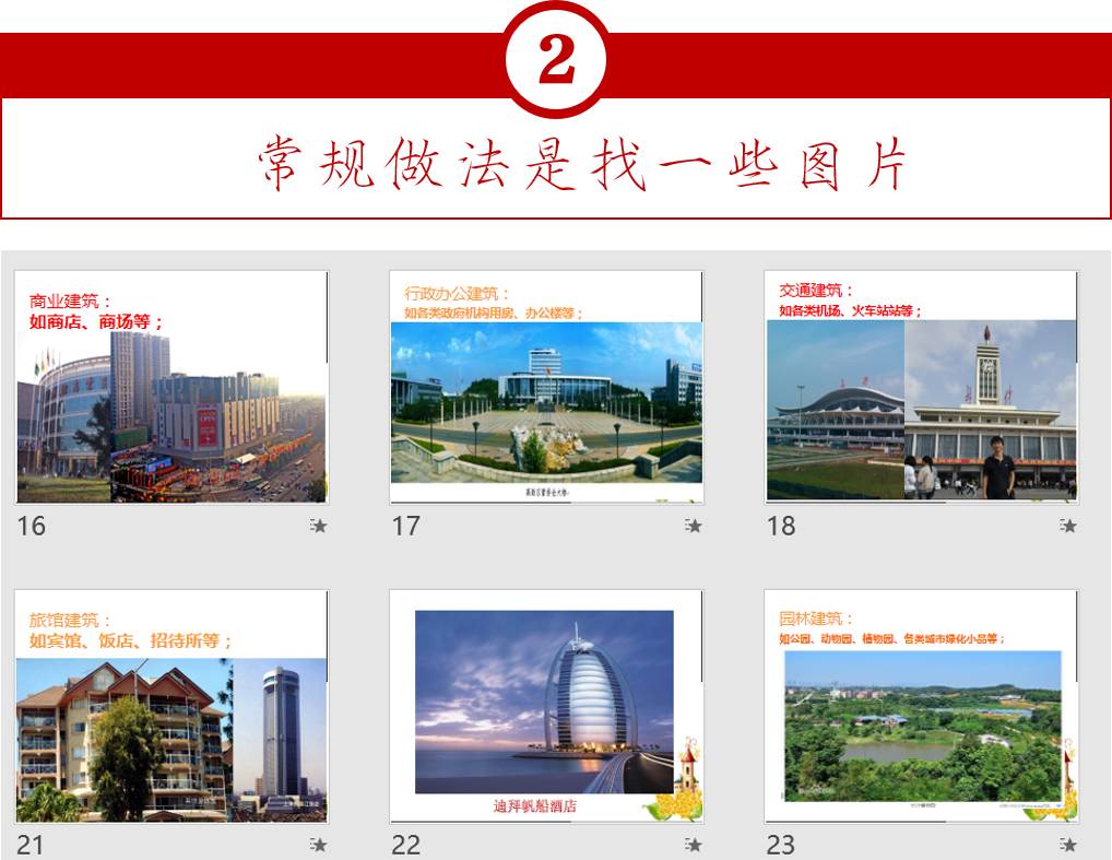 这一页PPT排版了多张公共建筑的图片,目的是为了阐述公共建筑的特点,这类举例很多,因此采用这一张排版方式。