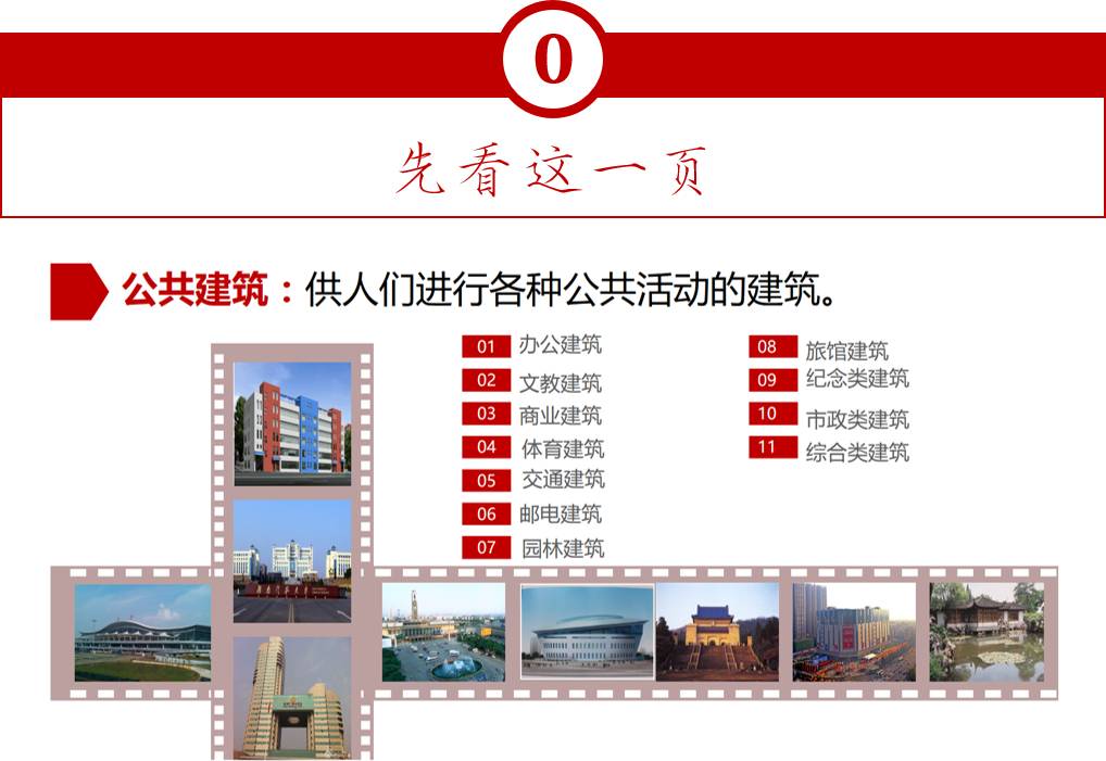 今天,进行一页《建筑构造与识图》中建筑类别举例的PPT,期待你喜欢