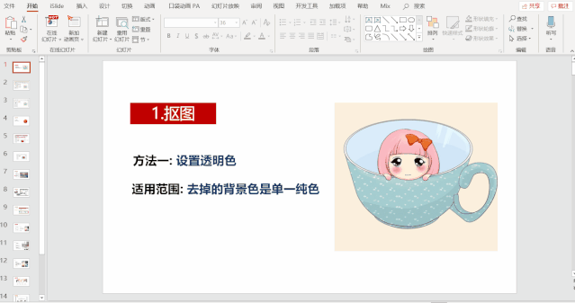 比如这个杯子的背景色纯色的,要想去除背景,就可以用【设置透明色】这个功能。(图片工具格式-颜色-设置透明色)