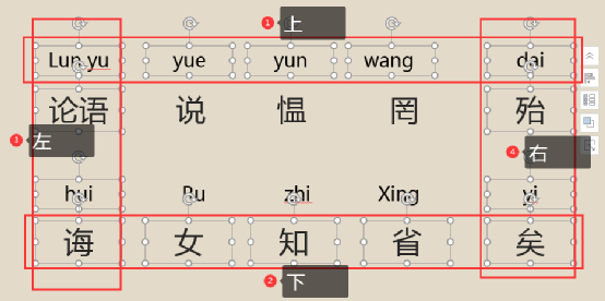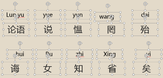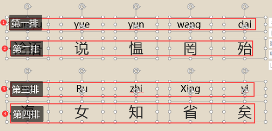 先将所有文字居中,然后将【格式】菜单下【大小】中的【宽度】改为3.8厘米,这样中文和拼音文本框的宽度就全部统一了。