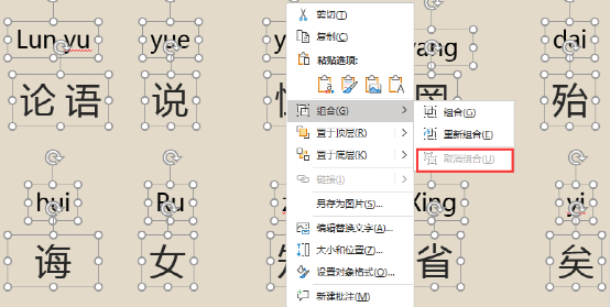 全选所有文字,不断重复右键【组合】——【取消组合】,直到【取消组合】变成灰色。