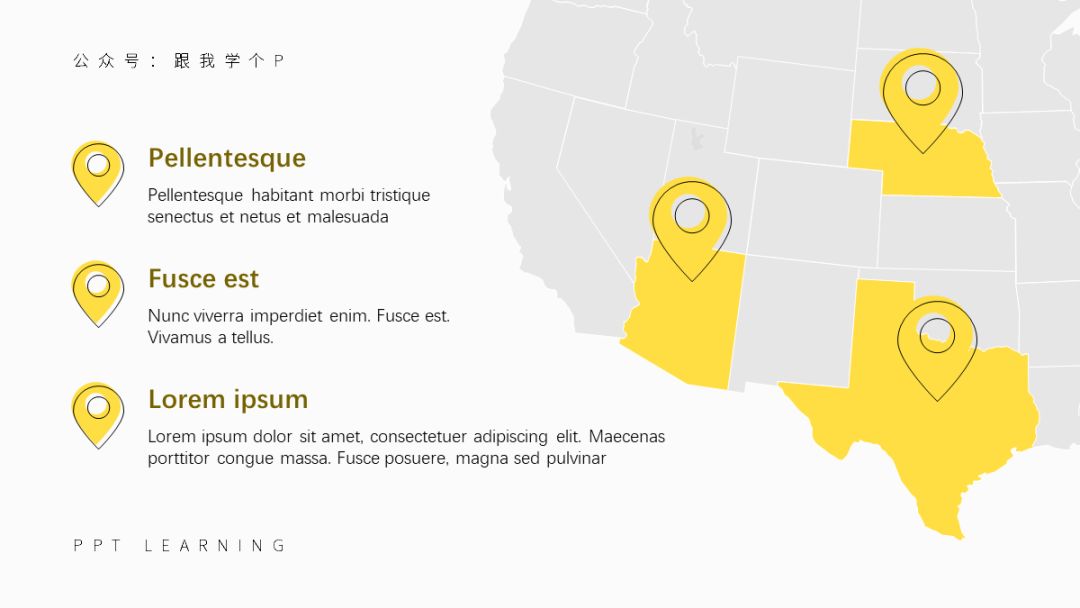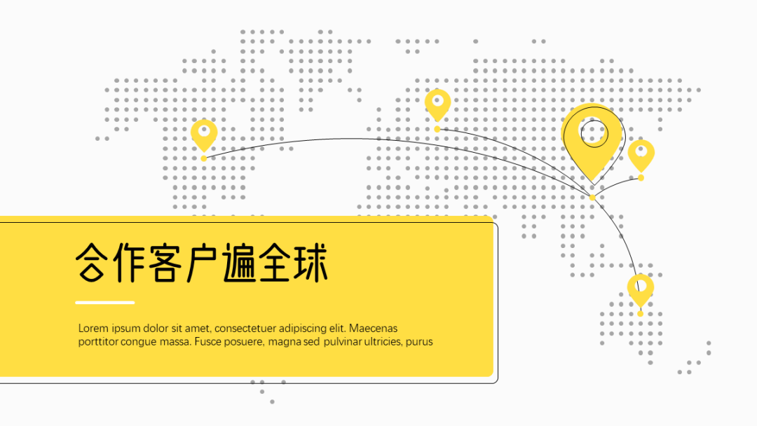 地图页的排版,常见于各类公司介绍,校招PPT或是课件类PPT中,因为这些PPT经常需要在PPT中标示出某个地点或是某片区域。