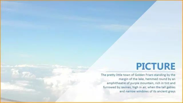 “整页”是比较常见的方式,我们可以考虑把图片放满PPT整页面,这样展示图片显得比较有气势,视野也宽广。这时,要配文的话,可以添加半透明色块,在上面配文字。