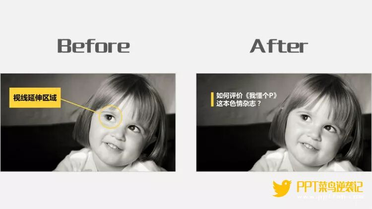 在画面的内容里眼睛的存在会形成一个视觉焦点,不管是人还是其他生物的眼睛,只要是看到眼睛,那么文字部分的排版就要依据“眼睛”(视觉焦点)而不是人本身(面)。因为我们的注意力,通常都会跟随画面主体视线而发声转移。
