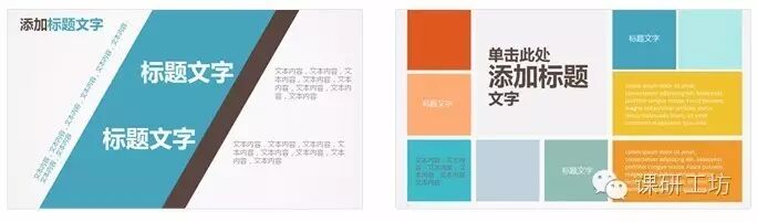 左边:不规则的色块与文字相结合很是提神,由于色块角度的倾斜打破了习惯性视觉,在提神的同时也会给浏览者造成一定的不适,建议在PPT页面排版中零星使用。