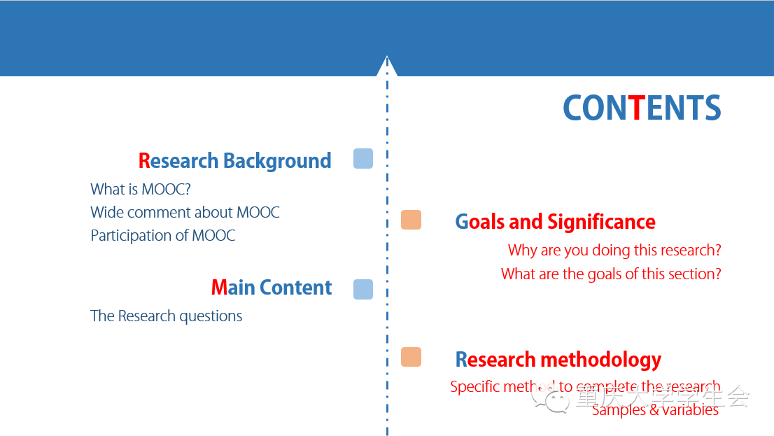 目录页是经常被同学们忽略的一个PPT环节,其主要职能是:概括演讲主要内容,给听众提供一个大纲