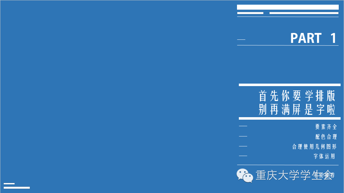 PPT的主要职能是辅助演说、传达信息。一个好的排版不仅能够让听众更好地理解你的演说,更能让听众觉得赏心悦目,从而产生视觉以至心灵的共鸣。
