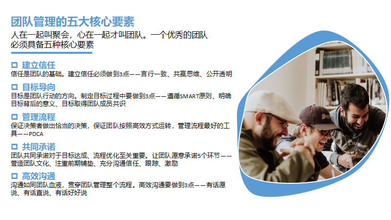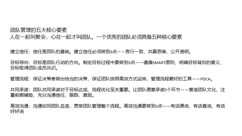 通过这段文字,我们可以获取的信息是其讲了团队管理的五大核心要素,分别是: