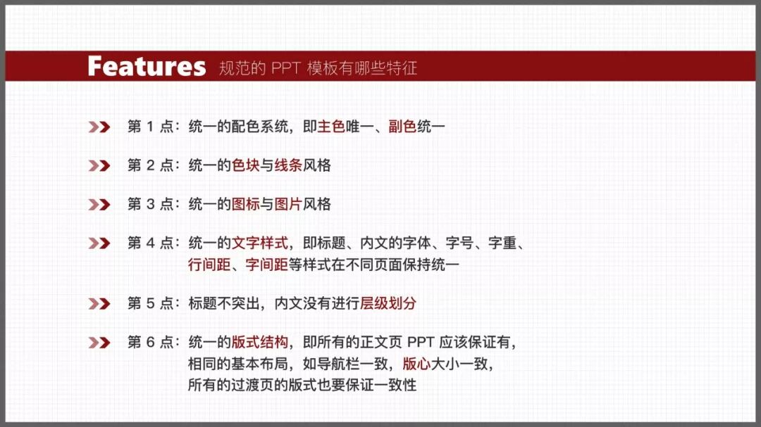 仔细分析二者区别,我们可以总结出,一套统一的 PPT 作品,它必须具备以下5个特征: