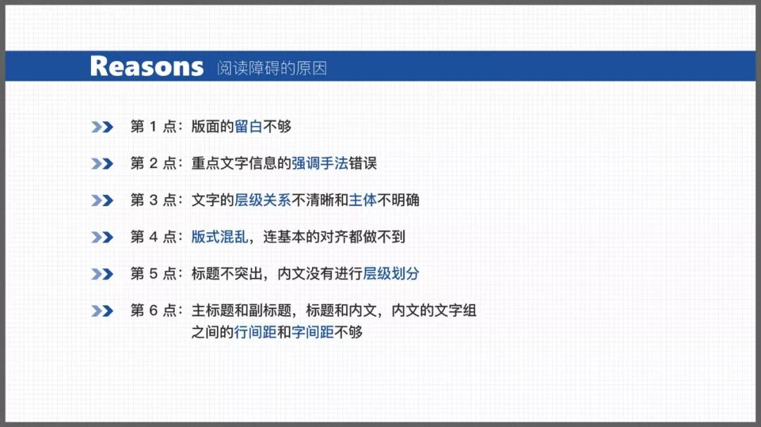 由于我们制作的 PPT 的版面中主体与层级关系的不明确,导致观者在视觉阅读上产生了障碍,也就是我们所感受到的不舒适。