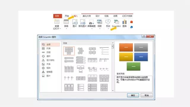 首先我们了解一下,这款神器在PPT中的位置,只要点击插入菜单就能在弹出的工具栏中找到SmartArt。打开之后,你会发现他有很多选项,有列表,流程,循环,关系,层次结构,矩阵,凌锥,图片等。