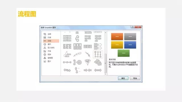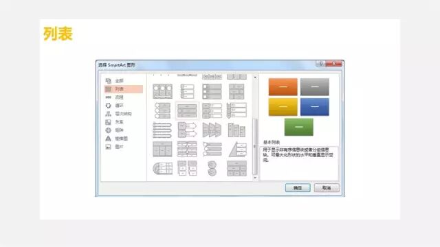 有列表、流程、循环、层次结构、关系、矩阵、凌锥图等七种不同类型的图表。下面看看列表。