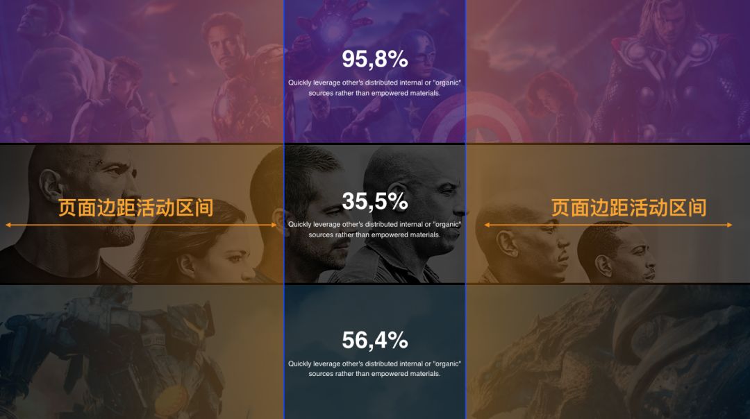 当充满画面时候,图片并非个体而是一个组。而当图片在版心之中时,图片则是个体,这一点和文字的逐行阅读与逐字阅读很像。在幻灯片排版时,多个图片其实是以图片组的整体形式围绕版心与页面边距的关系进行留白处理,是否留白以版心为界,如图所示: